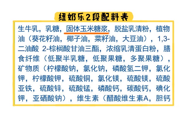 奶源和营养都对比分析过了,最后来看看原料这部分。纽奶乐2段和3段使用了玉米糖浆,大家要注意一下。