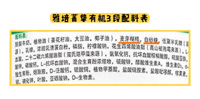 奶源和营养都对比完了,最后看看原料方面。菁挚有机2段之后添加了麦芽糊精,3段的时候还额外加入了白砂糖。