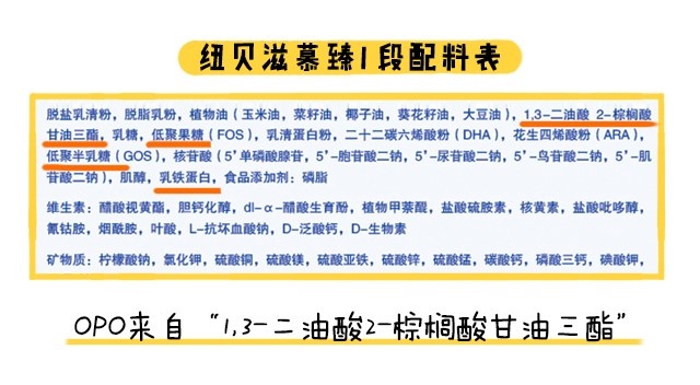 除了常规强化配方之外,营养这块在我这里还有另一种分类是特色强化配方,它指的是一些商家宣传自家奶粉特别添加进去,区别于其他品牌的营养素。纽贝滋慕臻全部段数是添加了乳铁蛋白、益生元组合(低聚半乳糖+低聚果糖)和OPO。