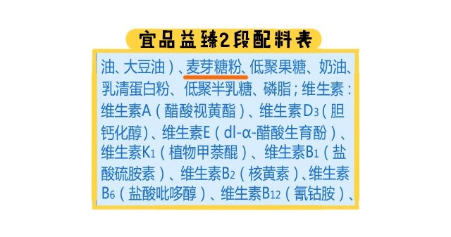 最后在原料方面,益臻2段之后添加了麦芽糖粉,麦芽糖粉的添加会降低碳水化合物中乳糖的占比,而麦芽糖粉的营养价值没有乳糖那么高。