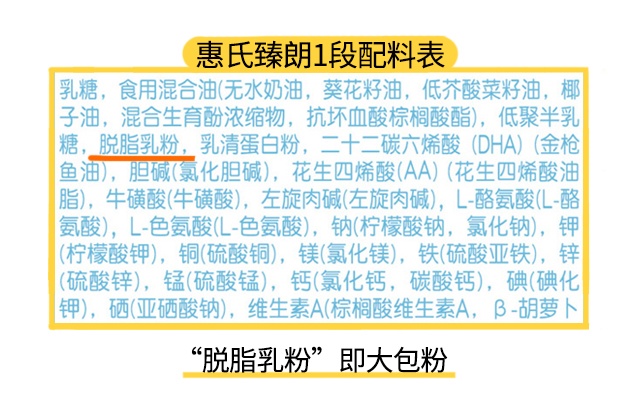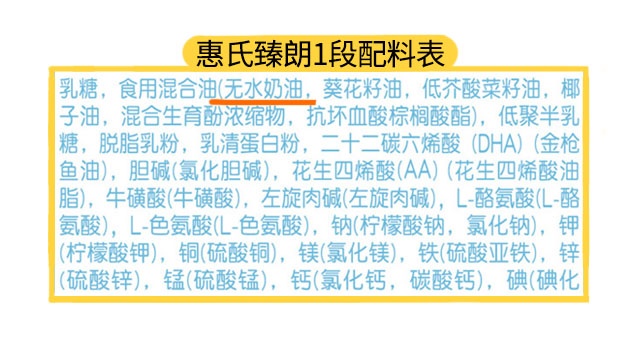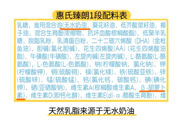 其实惠氏奶粉绝大多数都和铂臻一样,2段之后添加香精、麦芽糊精什么的,但比较难得,臻朗全部段数中均没有添加棕榈油、香精、麦芽糊精等。不过各位要稍加注意臻朗原料中无水奶油的添加,无水奶油可以丰富奶粉的脂肪酸种类,但由于它来源于牛乳,刚刚也提到,牛乳脂肪不太利于小月龄宝宝的消化吸收。