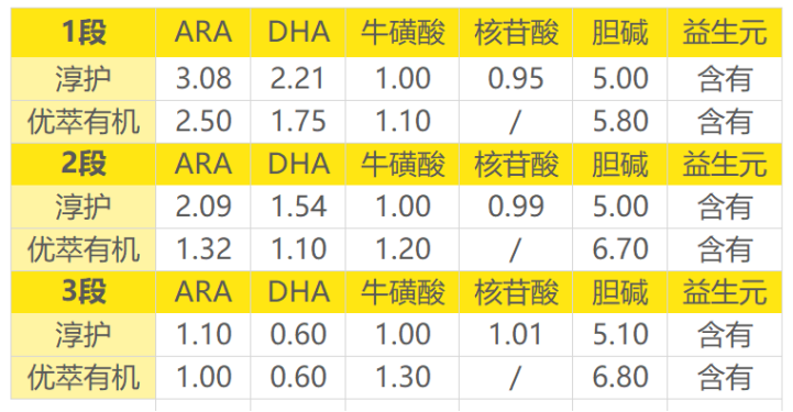 六个基础强化配方的添加情况,淳护是六个种类都有添加的,而优萃有机只有五个,缺少了核苷酸一个。而从添加量的角度来看,淳护的DHA和ARA添加量会比优萃有机要高,而胆碱的添加量则是优萃有机更好。