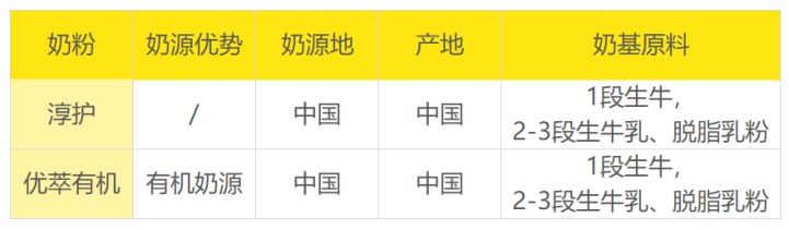 优萃有机的产地和奶源地同样也是中国,生产方式也如同淳护一样,1段采用生牛乳,2-3段采用生牛乳和乳粉。