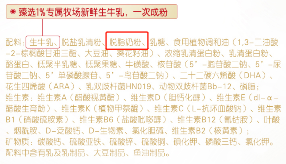 金领冠基础版3段的奶源和产地都是中国,奶粉使用生牛乳和脱脂乳粉作为奶基原料,生牛乳是指新鲜牛奶,新鲜牛奶的保质时间短,加工环节少,它能让婴儿配方奶粉更加新鲜且保留的牛奶成分更多。但可惜的是,除了生牛乳,金领冠基础版3段还添加了脱脂乳粉,脱脂乳粉的新鲜度和营养保留度都不如生牛乳理想。