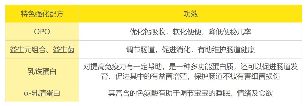营养方面,在DHA、ARA、核苷酸、牛磺酸、胆碱、益生元这6个基础强化配方中,金领冠塞纳牧有机各段数只占4个,缺少了核苷酸、牛磺酸,2段和3段连胆碱也没有添加进去了。至于特色强化配方部分,金领冠塞纳牧有机算是有机奶粉中比较丰富的,各段数都加入了OPO、乳铁蛋白、益生元组合、益生菌、α-乳清蛋白,这些营养素的具体功效如下表。