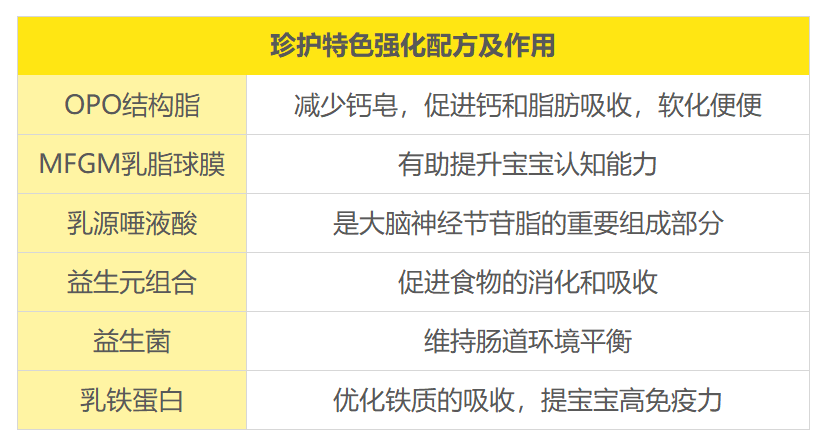 营养方面,ARA、DHA等六个基础强化配方,珍护3个段数都是添加齐全的。而特色强化配方,珍护一共加入了六个,分别是OPO结构脂、益生元组合、益生菌、MFGM乳脂球膜、α-乳清蛋白、乳源唾液酸。这些特色强化配方的作用,大家可以参加下图。