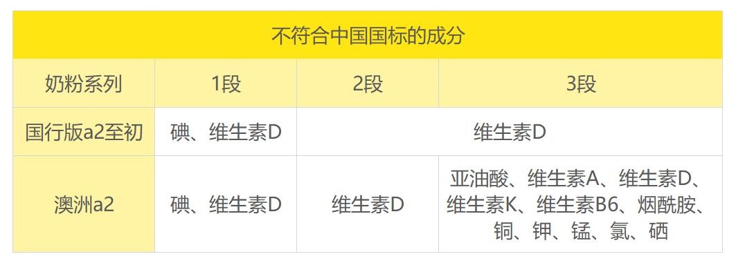从下表可以看出,两款奶粉都存在基础营养素不达标的情况,其中澳洲a2奶粉3段中,不符合中国标准的基础营养成分比较多,与a2至初奶粉的差别还是比较明显的。