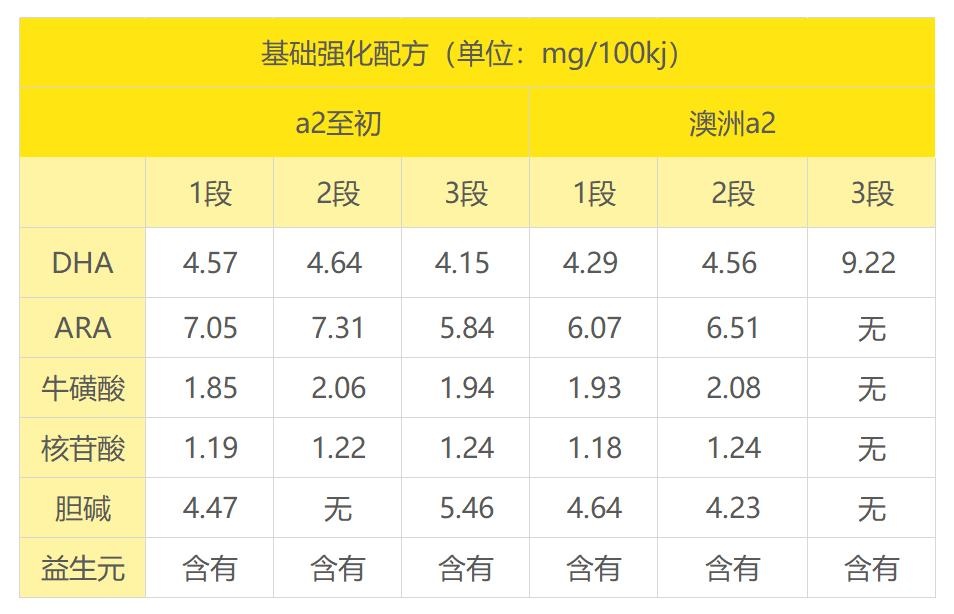 a2至初1段和3段是6项基础强化配方齐全。2段缺少一个胆碱。澳洲a2奶粉1段和2段添加了6项,3段则缺少4项。添加量方面,我着重说说大家比较关注的DHA,a2至初1段和2段所添加的DHA比澳洲a2多些,3段是澳洲a2比a2至初多出一倍。