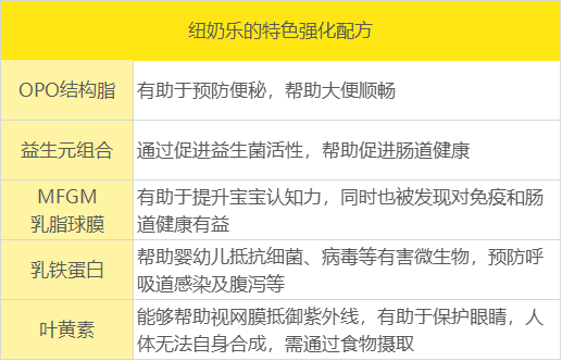 至于特色强化配方,指的是一些商家为了丰富奶粉营养,并以此作为卖点,提高市场竞争力而添加的配方。纽奶乐奶粉是添加了OPO结构脂、益生元组合、乳铁蛋白、叶黄素、MFGM乳脂球膜这5个特色强化配方,为宝宝提供了丰富的营养。其中OPO结构脂、益生元组合都是有助于孩子消化吸收的成分,而乳铁蛋白则是能帮助调节孩子的免疫系统,叶黄素有助于眼睛发育,MFGM乳脂球膜则是对大脑发育有帮助。可以看出,纽奶乐这款奶粉的特色强化配方的作用还是比较全面的。