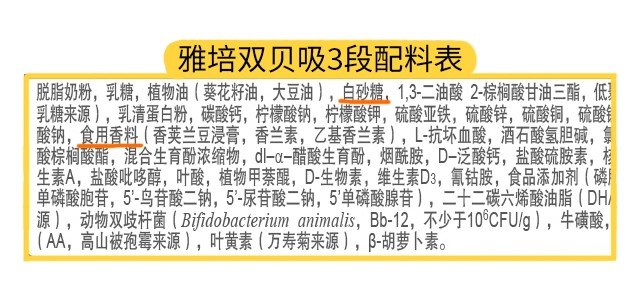 除此之外,双贝吸3段还加入了白砂糖,白砂糖也就是蔗糖,蔗糖的添加目的是增甜,和香精一样都是不太利于培养宝宝清淡健康的饮食习惯,而且长期食用蔗糖会增加肥胖和蛀牙的几率。