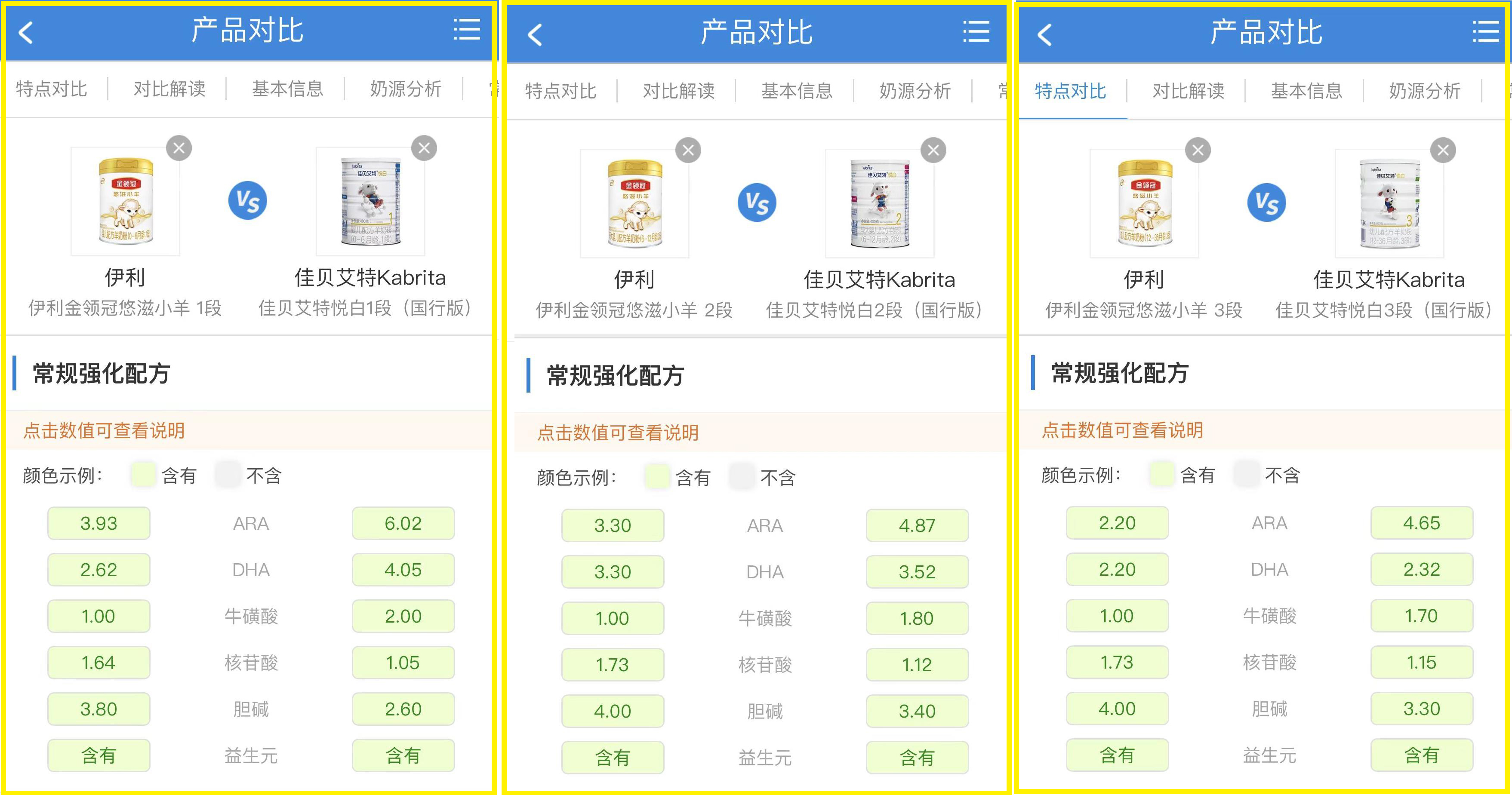 至于在营养方面,这两款羊奶粉都是基础营养符合现行国标,能够满足我国宝宝的基本营养需求,以及常规强化配方六项齐全,含有ARA、DHA、牛磺酸、核苷酸、胆碱和益生元。两者的区别,主要体现在常规强化配方的添加量和特色强化配方的添加种类两个方面。如下图两款奶粉各段数的对比所示,佳贝艾特悦白的ARA、DHA、牛磺酸含量都比金领冠悠滋小羊要高一些,而悦白所含的核苷酸、胆碱含量,则比悠滋小羊要低一些。