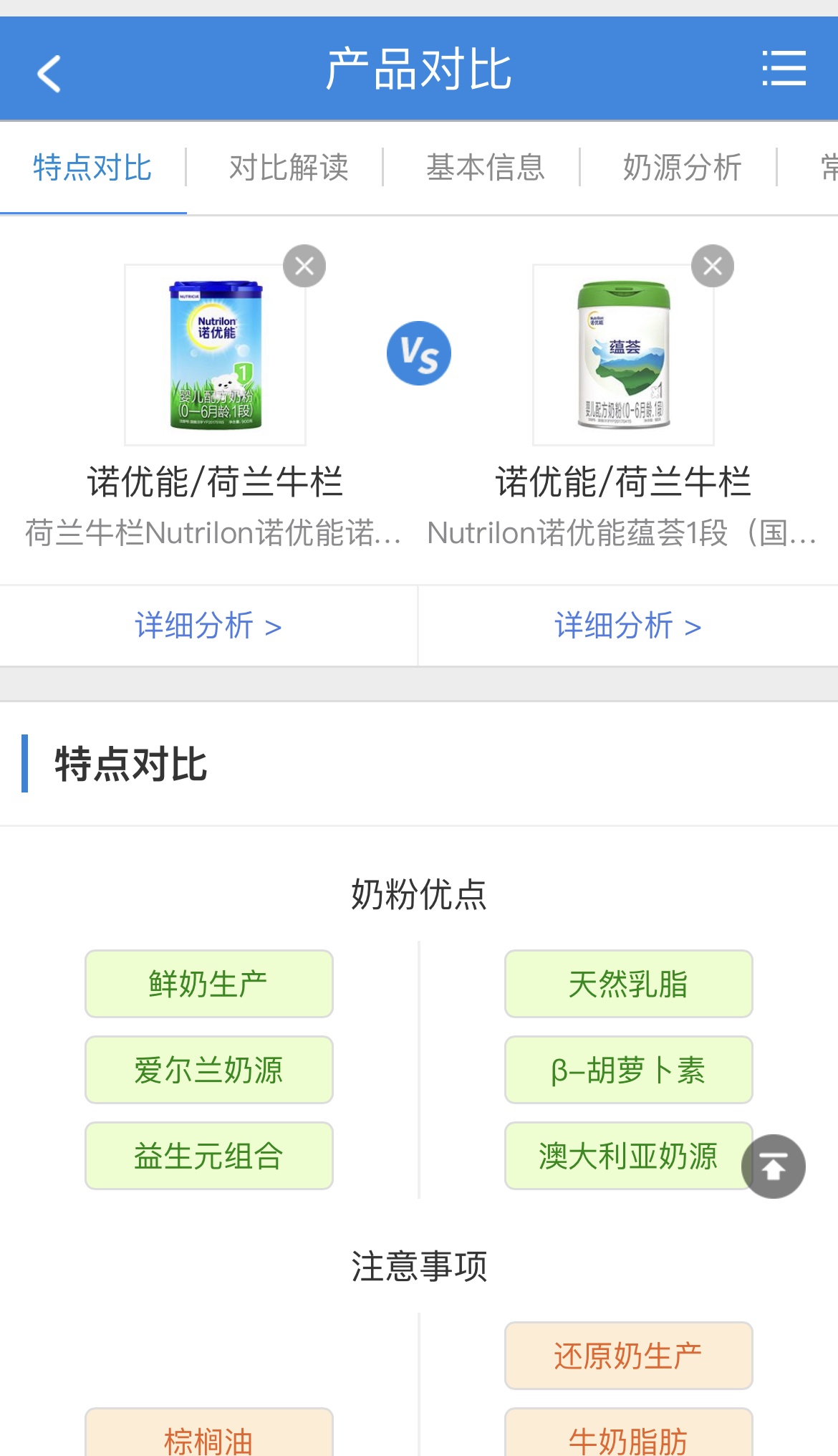 如果大家想看更详细的对比分析,比如2款奶粉各种营养配方的添加量有多少差别等,可以点击下方图片,进入对比页面查看。