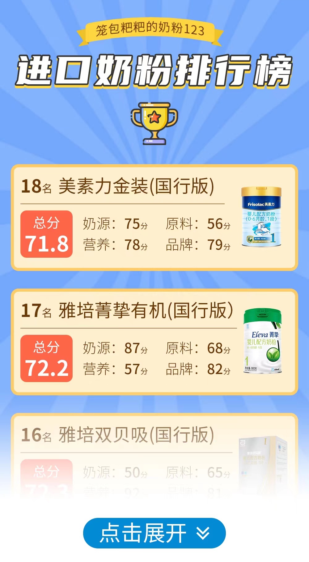 另外,如果大家还想看看其他品牌一些比较优秀的国行奶粉,我这里有一份《国行奶粉排行榜》,各位有需要的话,可以点击下面图片,进入榜单挑选看看。
